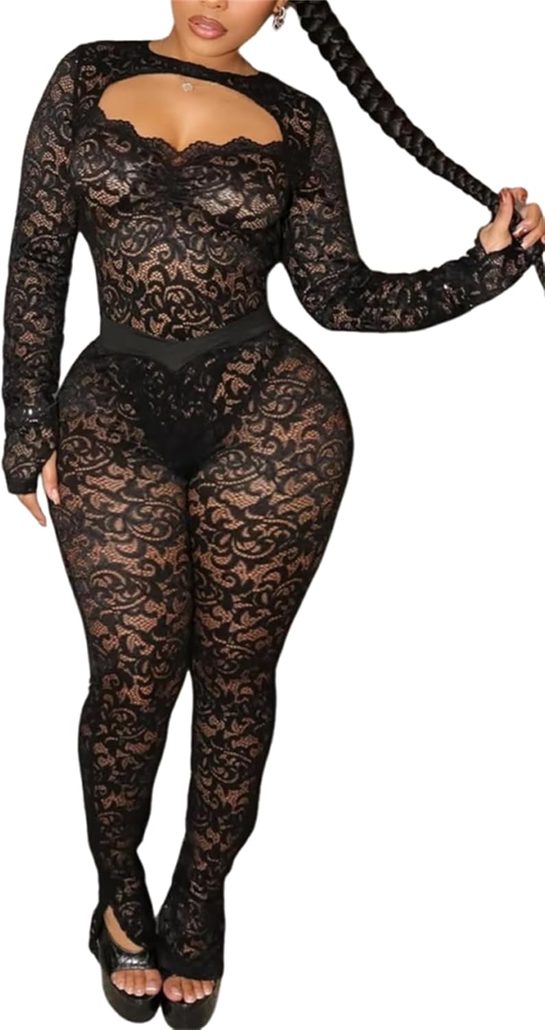 CALEBGAR Sexy 2 Piece Outfits for Women Lace See Through Long Sleeve Backless Bodysuits Bodycon Flared Leggings Set
