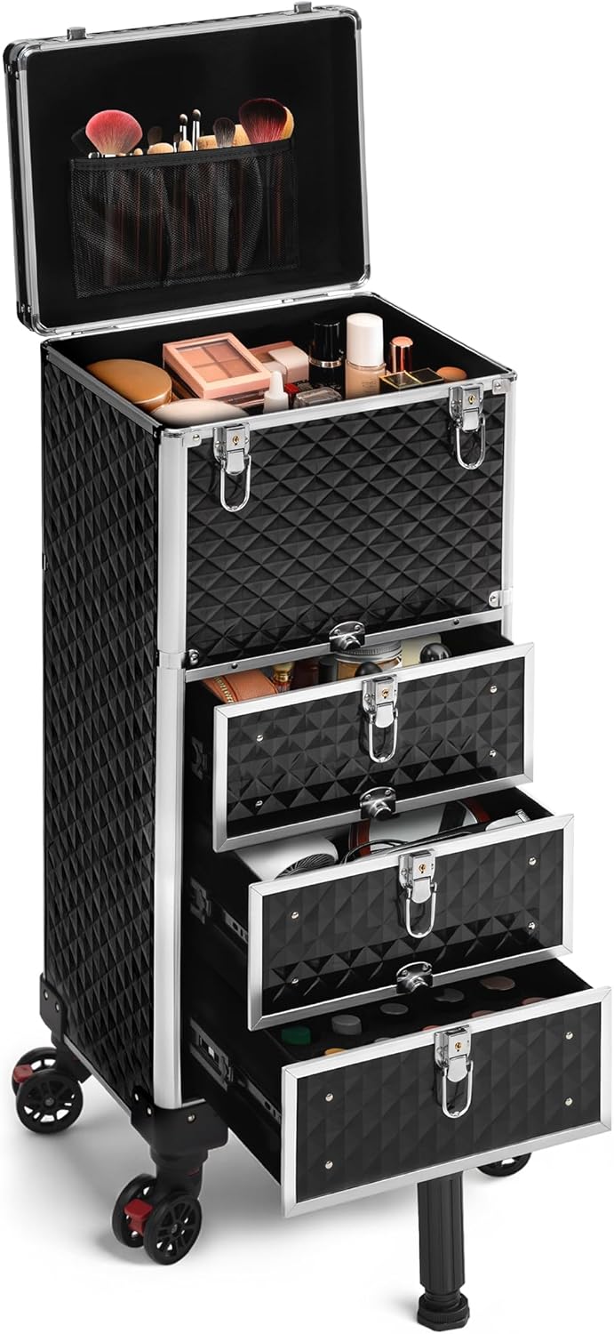 - 【Anti-falling Rolling Makeup Case with Lockable Wheels】4 Pcs wheels with brakes prevent the makeup cart from sliding during use. It also features an independent support bracket that props up the bottom drawer when in use, preventing the cart from tipping over during operation