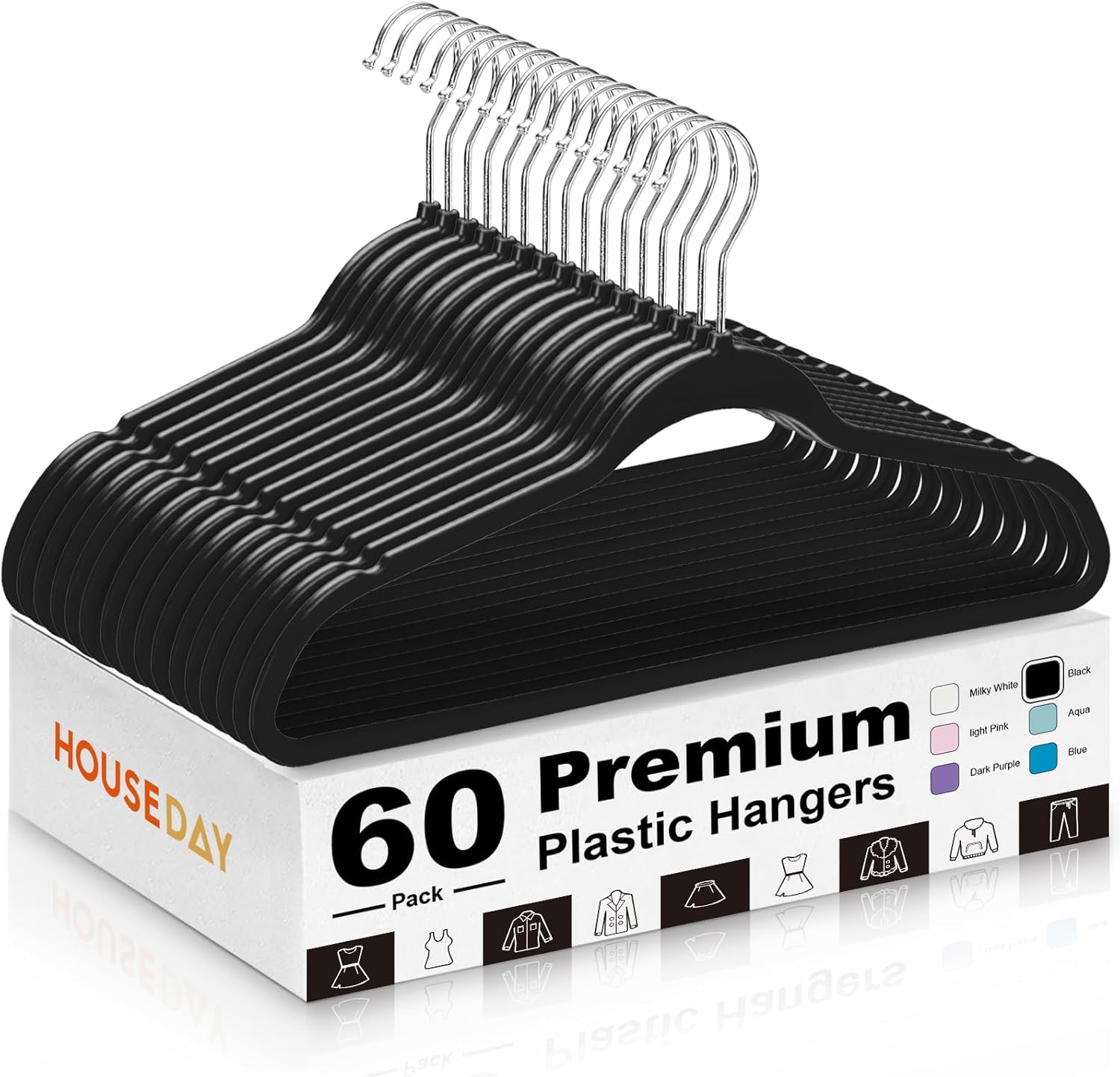 HOUSE DAY Black Plastic Hangers 60 Pack - Heavy Duty Non-Velvet Hangers with 360° Swivel Chrome Hook & Non Slip Notches - Slim Space Saving Clothes Hangers Ideal for Dresses Coats Shirts Jackets