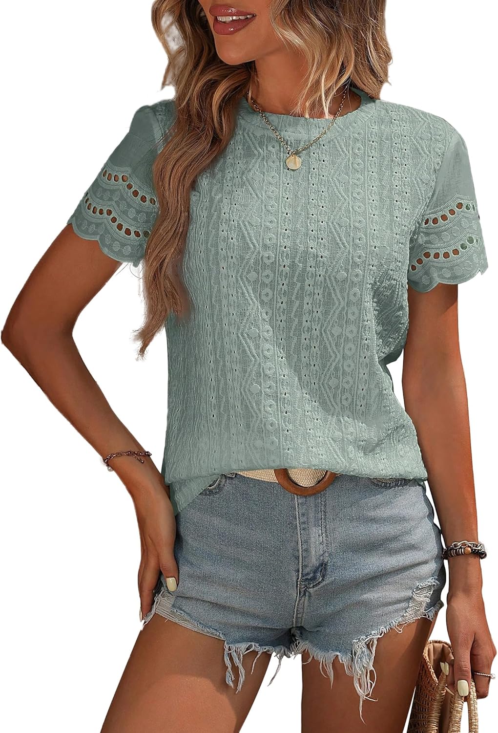 Womens Summer Tops Crewneck Short Sleeve Shirts Casual Textured Eyelet Top Dressy Blouses