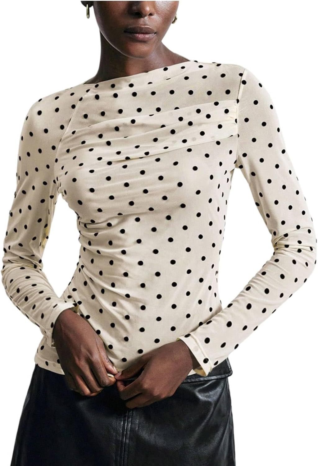 Milumia Women's Polka Dots Ruched Mesh Top Y2k Boat Neck Long Sleeve Going Out Tee Tops