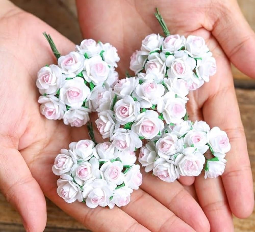 Handmade 50 pcs Mini Mulberry Paper Roses 18 mm Mulberry Paper Flowers Scrapbooking Wedding DIY Craft. (White Rose Inner Pink)