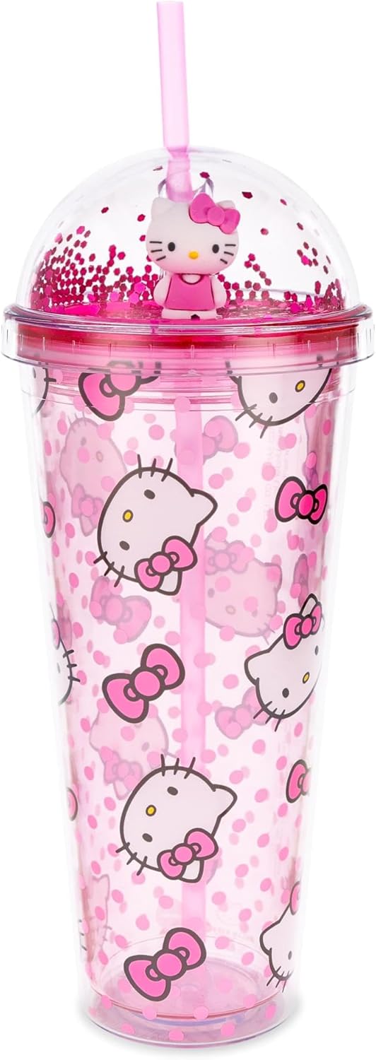 - HELLO KITTY TRAVEL TUMBLER: Travel tumbler is decorated with various images of Hello Kitty and bows. Center of the dome lid features a 3d image of Hello Kitty and includes glitter. Travel tumbler is complete with a pink straw.