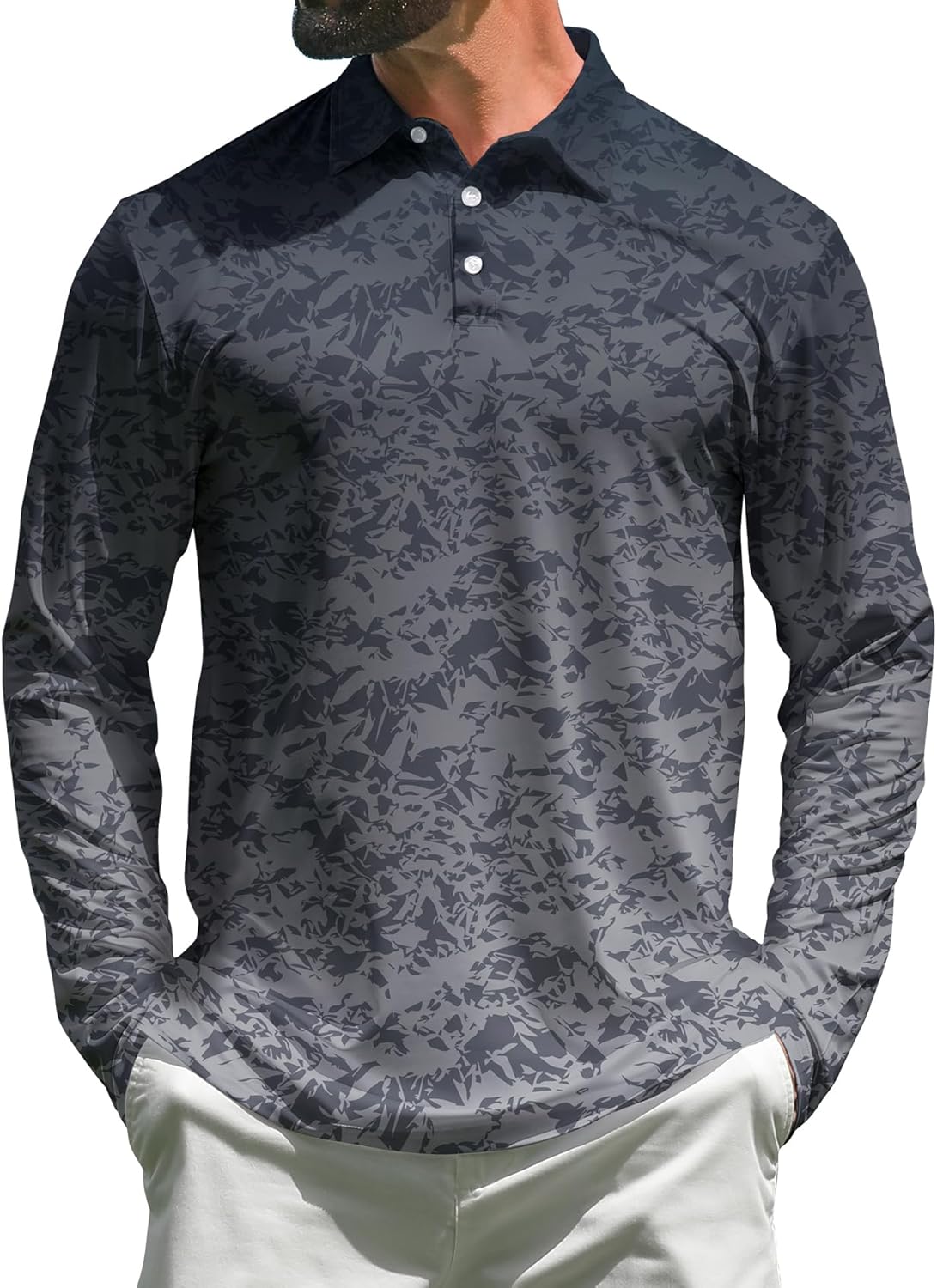 ELETOP Mens Golf Shirts Long Sleeve Print Performance Polo Shirts Moisture Wicking Dry Fit Golf Polo for Men