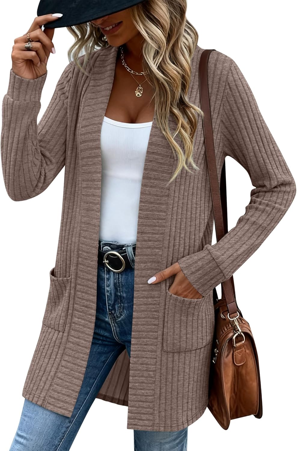 Women's Long Cardigan Sweater with Patch Pockets, Open Front Long Sleeve Lightweight Loose Ribbed Knit Coatigan