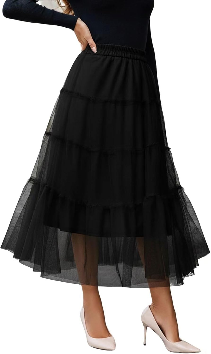 Tulle Skirts for Women 2025 Fall Fashion Elastic High Waisted Fairy Tiered Flowy A-Line Casual Maxi Long Skirt