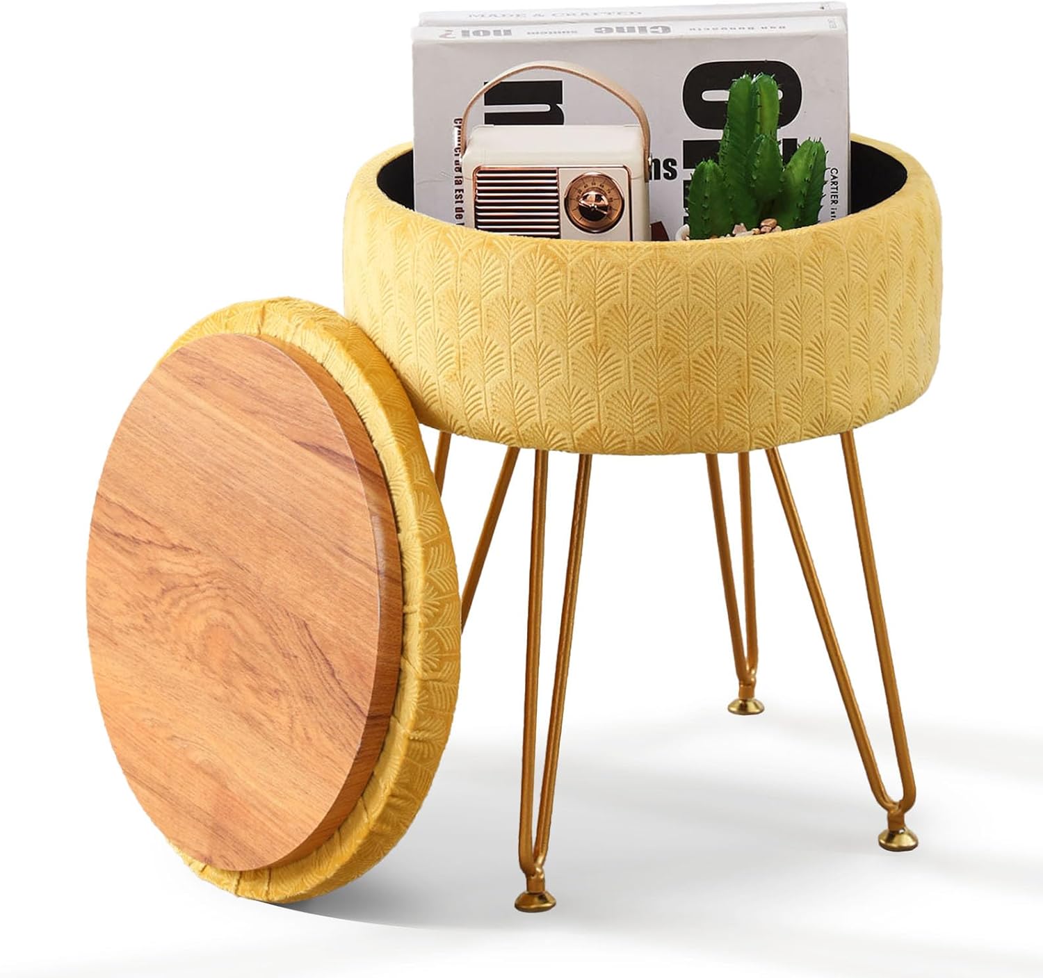 - Multiple Functional Stool: The gingko leaf print velvet ottoman is not only a foot rest, but also can be a vanity chair and a padded seat. The top cover can also be turned over to become a small table, you could put a cup of coffee or some desserts on it to have a pleasant time. Elegant bright colors match the gold metal legs is stylish and exquisite, perfect for putting anywhere as home decor
