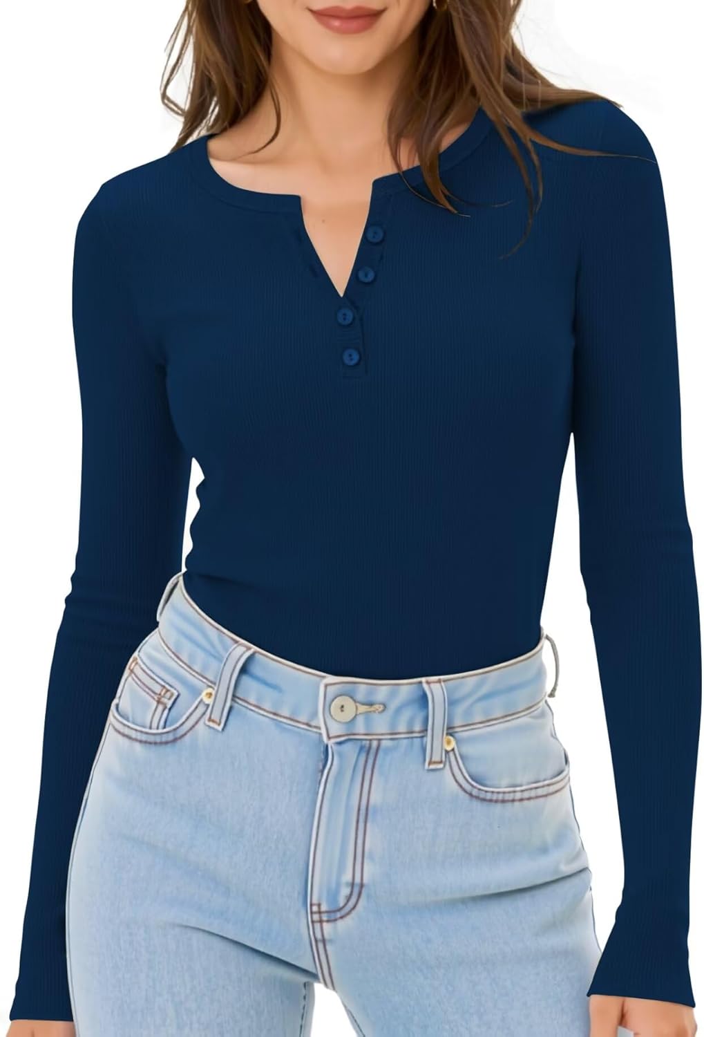 Women's Long Sleeve Henley Tops, Slim Fitted Ribbed Casual Tee, Stretchy Base Layer Shirts