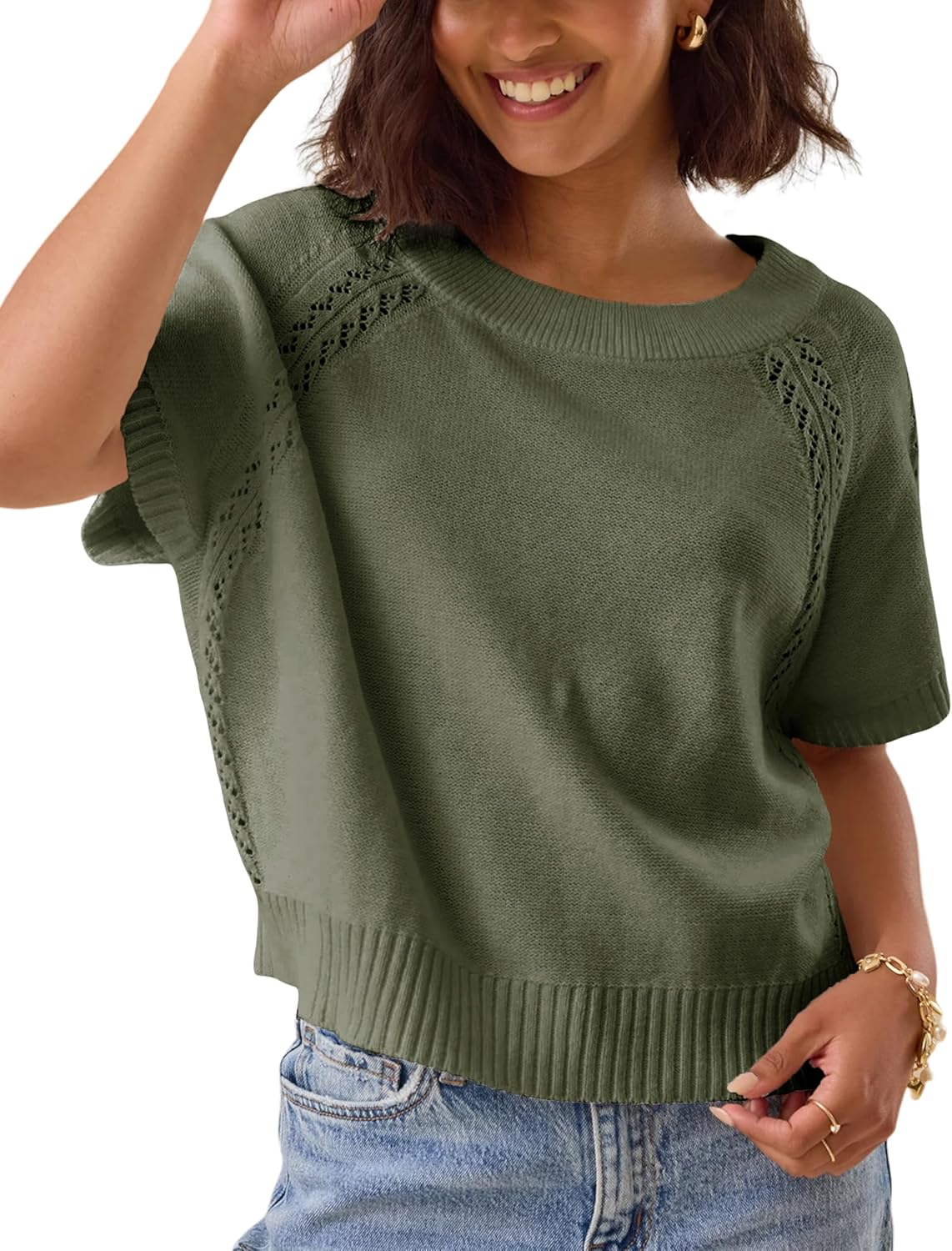 Yeokou Women Knit Crochet Top Short Sleeve Crew Neck Loose Fit Pullover Sweater Summer Fall Fashion Casual Knitted Blouse