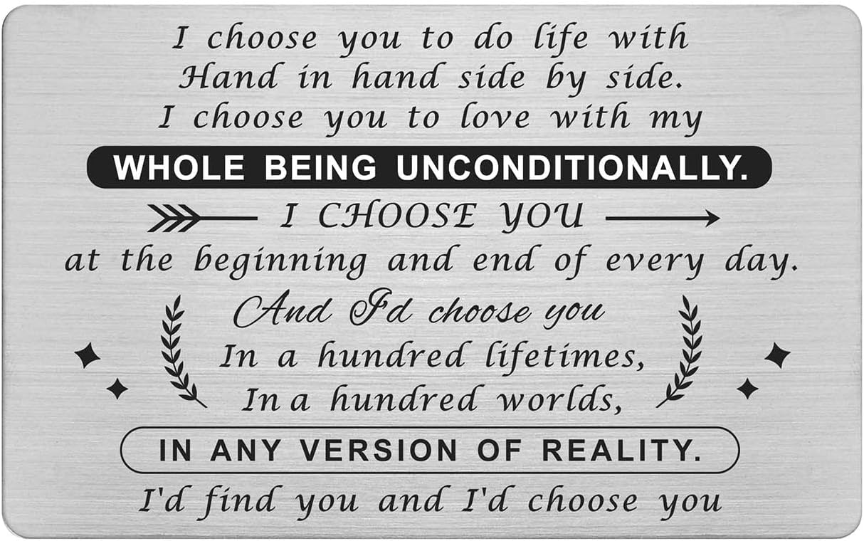 - I Choose You Gifts * I Choose you to do life with hand in hand side by side. I choose you to love with my whole being unconditionally. I choose you at the beginning and end of every day. And I'd choose you in a hundred lifetimes, in a hundred worlds, in any version of reality. I'd find you and I'd choose you