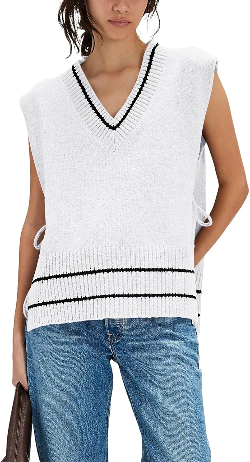 Yesfashion Womens Sleeveless Striped Ponch Sweaters V Neck Color Block Tie Side Going Out Knit Pullover Sweater Vest Tops