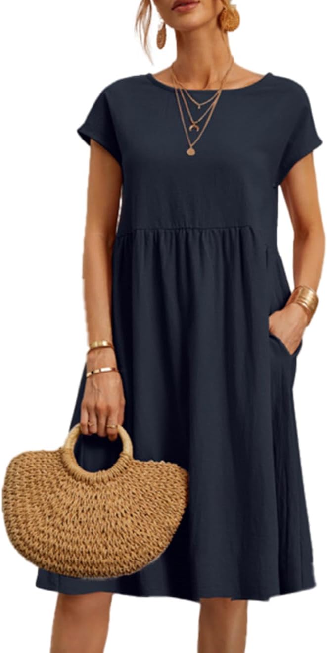 Women's Dress 2024 Casual Summer Cotton Dress with Pockets Short Sleeve Loose Midi Shirt Dress