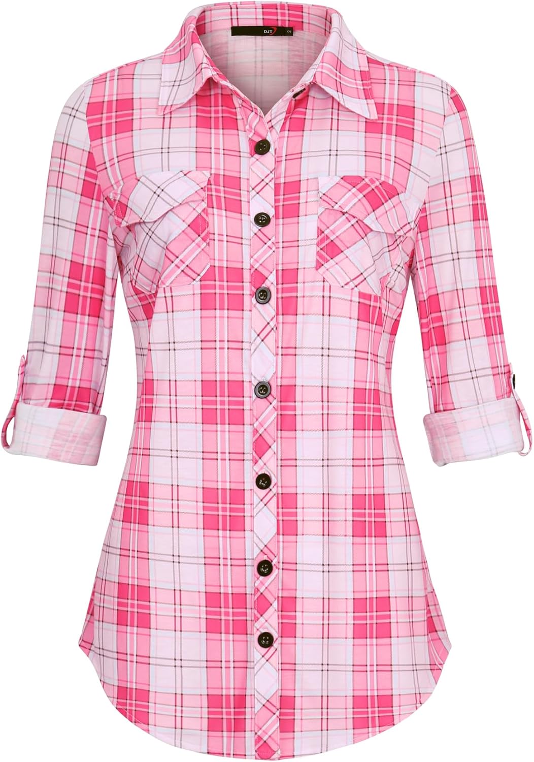 DJT Womens Soft Stretchy Knit Plaid Shirts Roll Up Long Sleeve Collared Button Down Blouses Tops