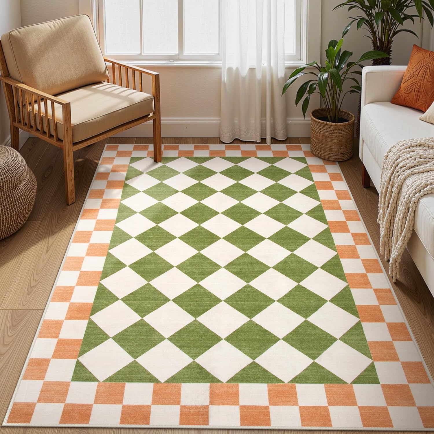 Morebes Green Checkered Rugs for Living Room, 4x6 Washable Area Rug for Bedroom, Geometric Checkerboard Soft Low Pile Playroom Rug, Non Slip Carpet for Dining Room Nursery Dorm Home Decor