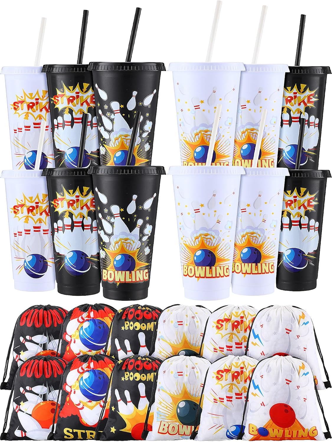 24 Pcs Bowling Party Favors Bowling Party Plastic Cups Bowling Party Drawstring Backpack Bag 24 oz Bowling Tumbler Bowling Party Favor Bags for Bowling Birthday Team Party Supplies Gifts