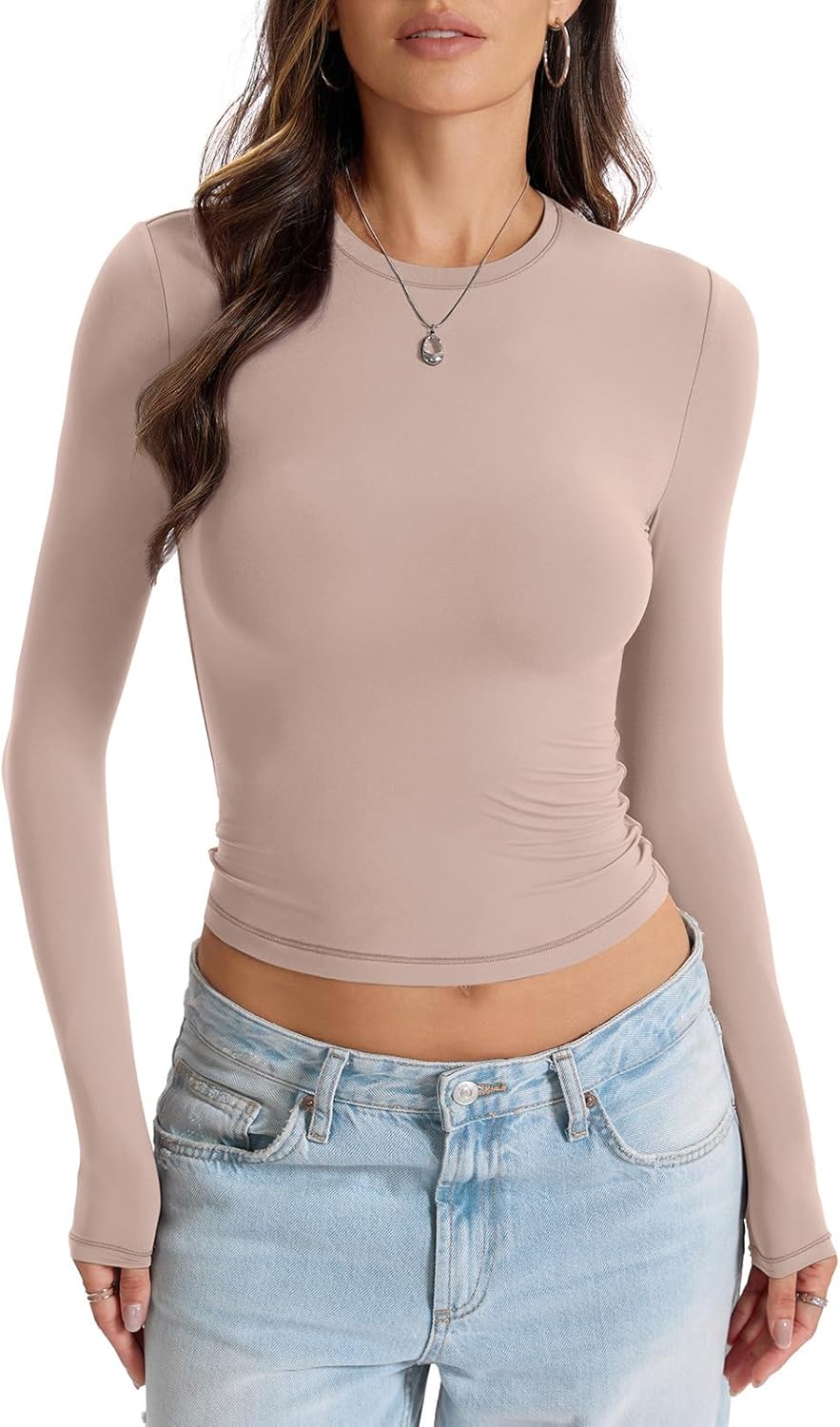 Womens Double Lined Long Sleeve Tops Crew Neck Fitted Basic T Shirts Crop Going Out Tops 2026