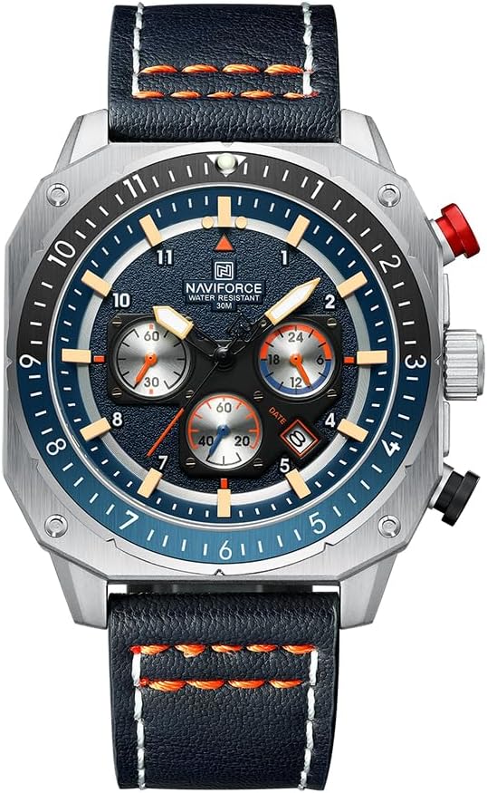 NAVIFORCE Men's Fashion Sport Watches Military Square Big Face Waterproof Chronograph Wristwatch with Luminous Hands,Leather Strap