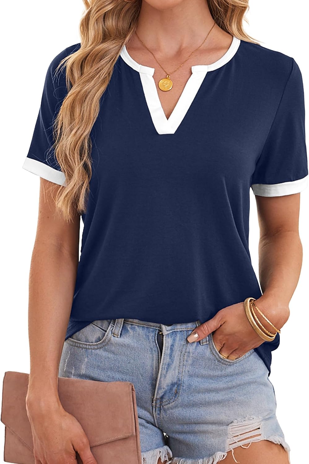 LilyCoco Women's Striped Shirt Short Sleeve Color Block Tops Notched Neck Summer Tee