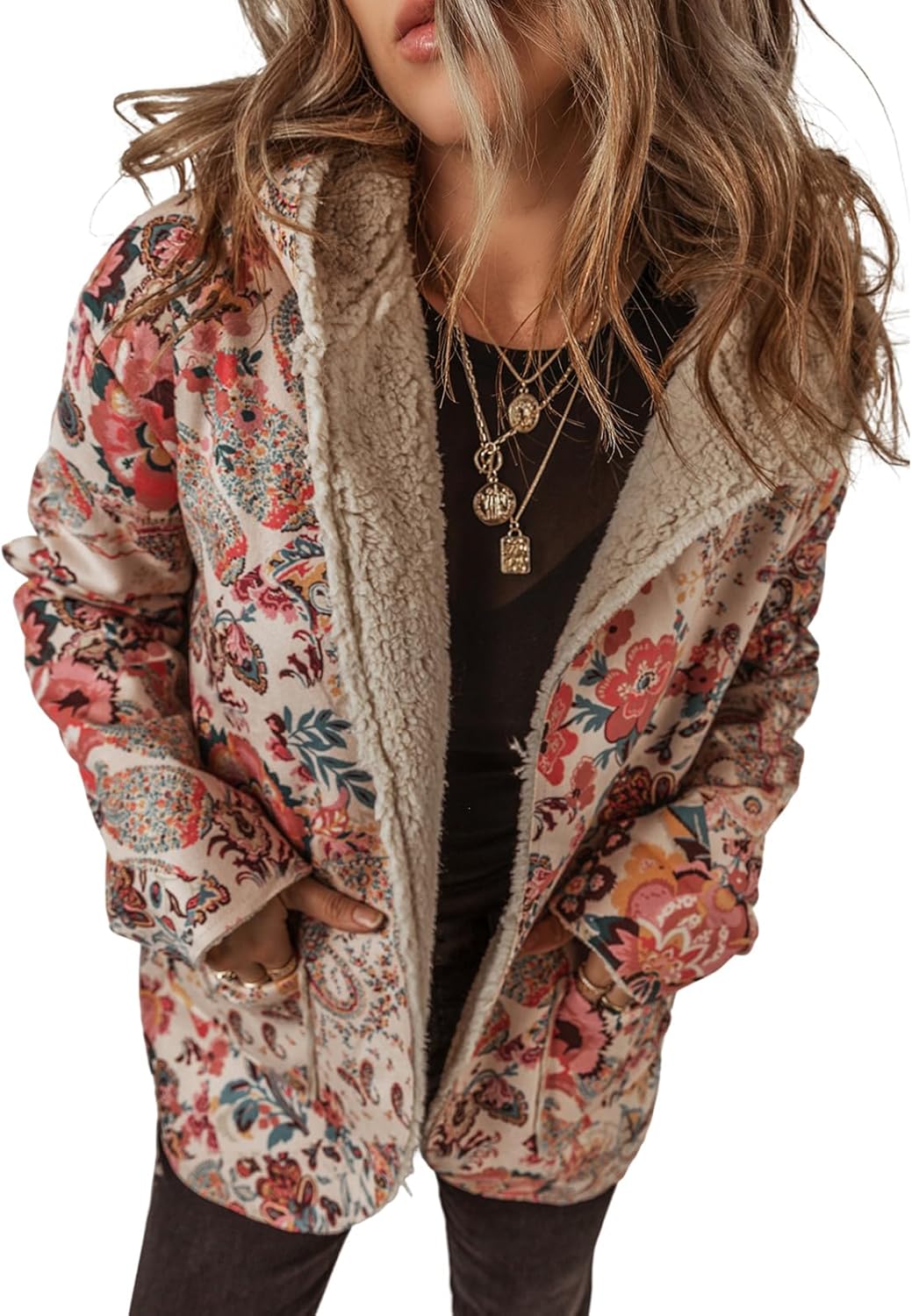 Women's Winter Plush Hooded Jacket Retro Floral Prints Fleece Lined Open Front Coat with Big Pockets