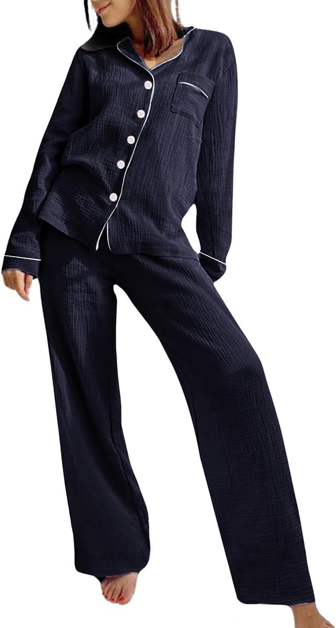 Womens Muslin Pajamas Set Cotton Gauze Pj Set Long Sleeve Button Down Sleepwear Soft Pj Lounge Sets