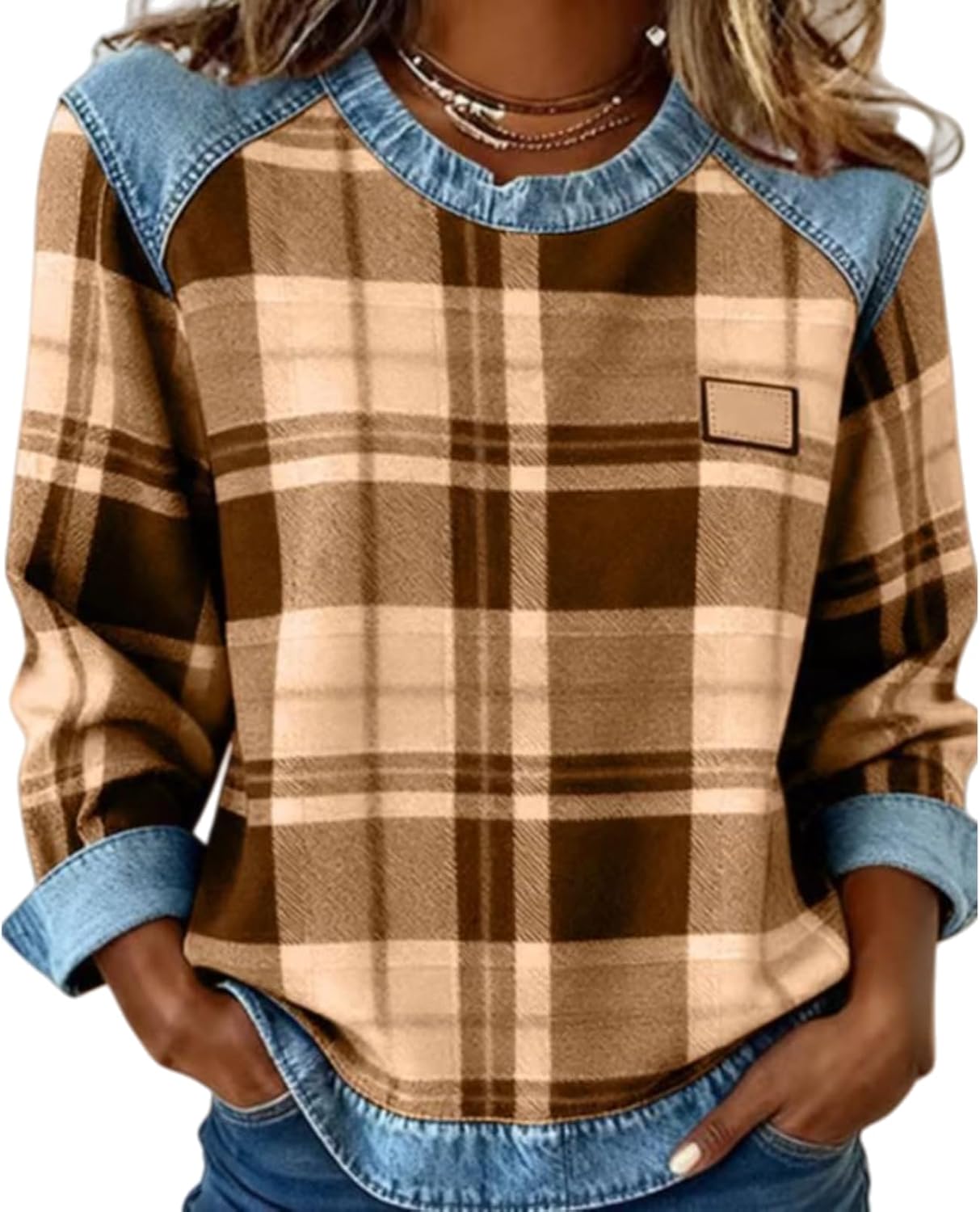 Women's Denim Patchwork Sweatshirts, Crew Neck Long Sleeve Color Block Sweatshirt, Plaid Pullover Sweatshirt for Women