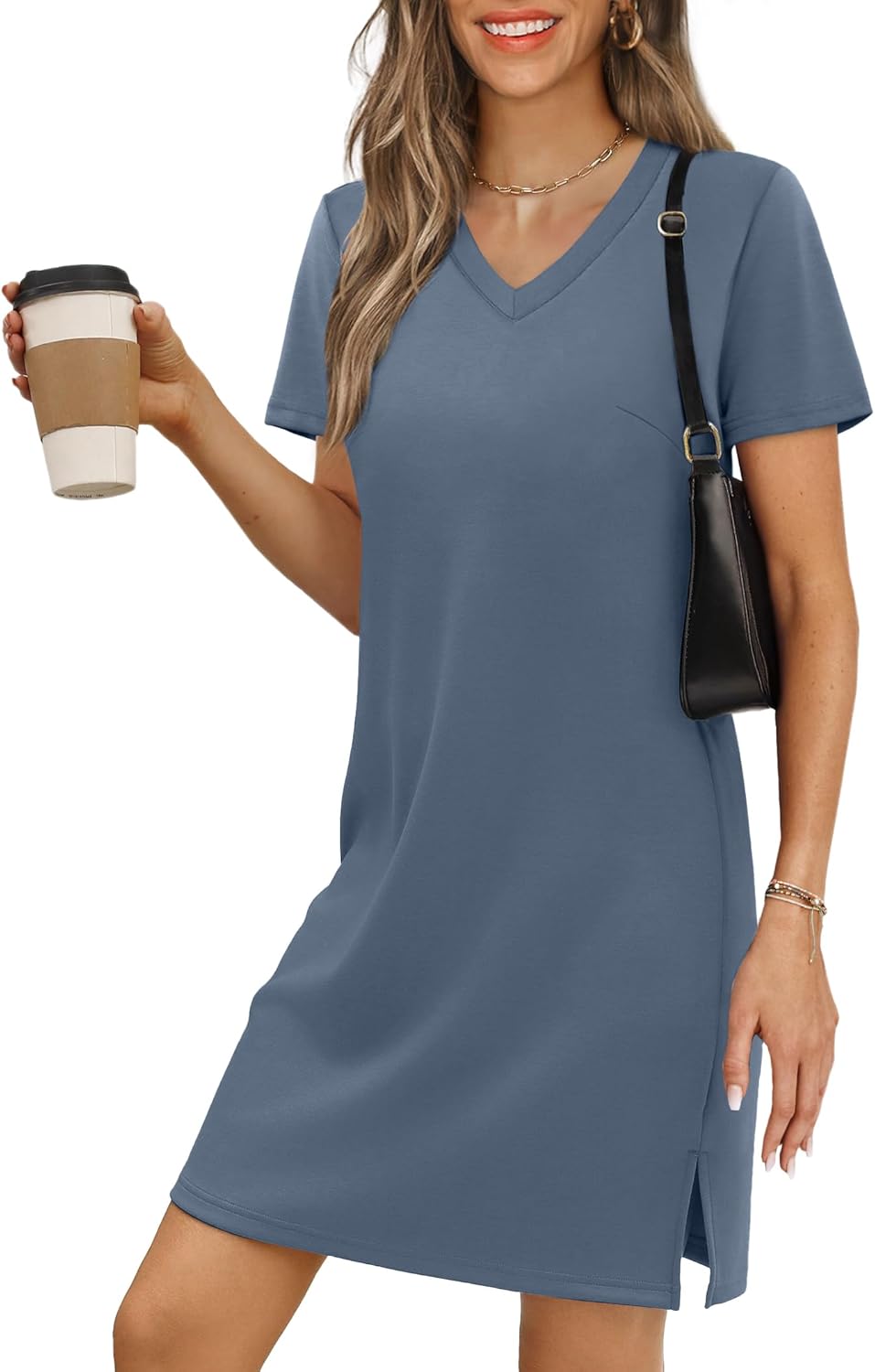 RUMIA Summer Casual Dresses for Women 2025 Vacation Dress V Neck Short Sleeve Split Hem Beach Sundress Dustyblue M