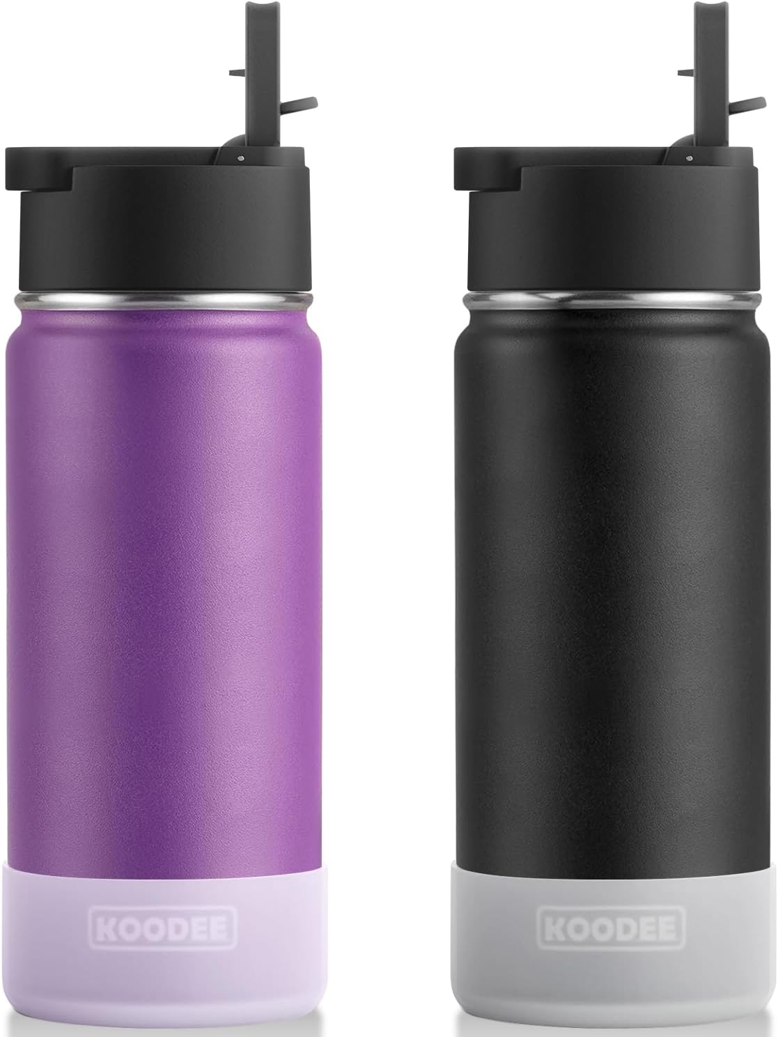 koodee 2 Pack Water Bottle with Straw 18 oz Stainless Steel Double Wall Insulated Water Bottle with Sleeve, BPA Free (Purple-Black)