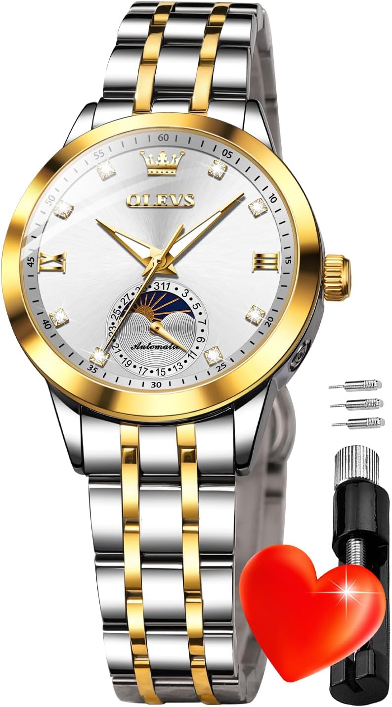 OLEVS Womens Automatic Watches Gold Classic Diamond Ladies Self Winding Mechanical Two Tone Stainless Steel Wrist Watch Date