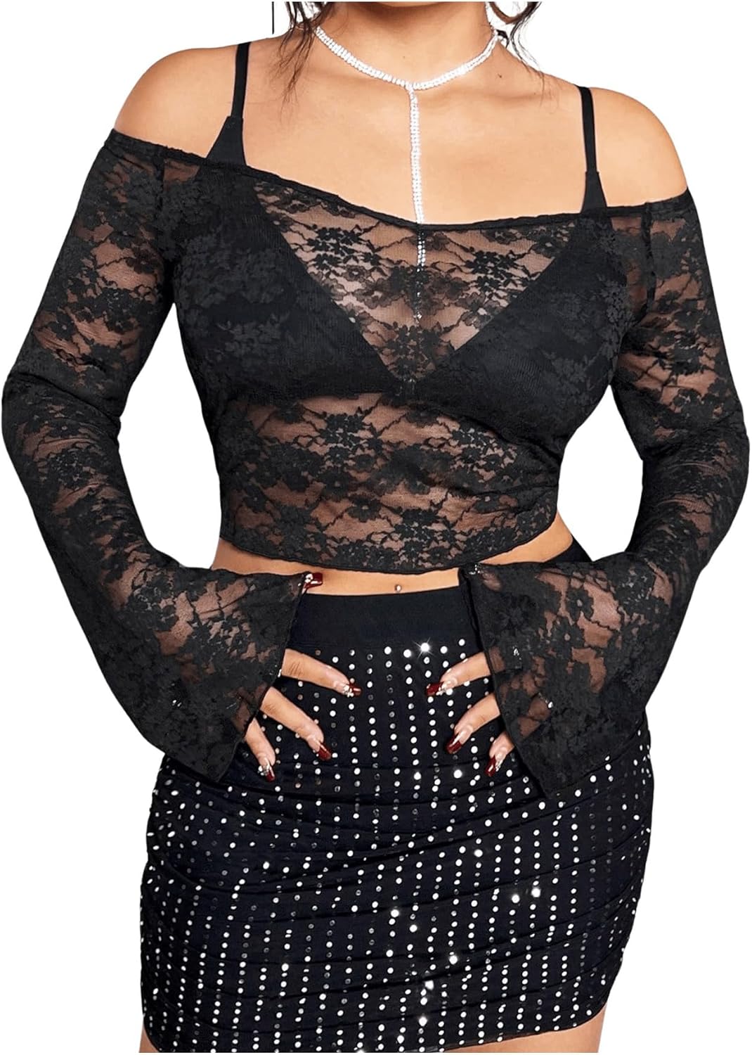 SHENHE Women's Plus Size Lace Tops Bell Sleeve Off The Shoulder Sexy Sheer Rave Crop Tops