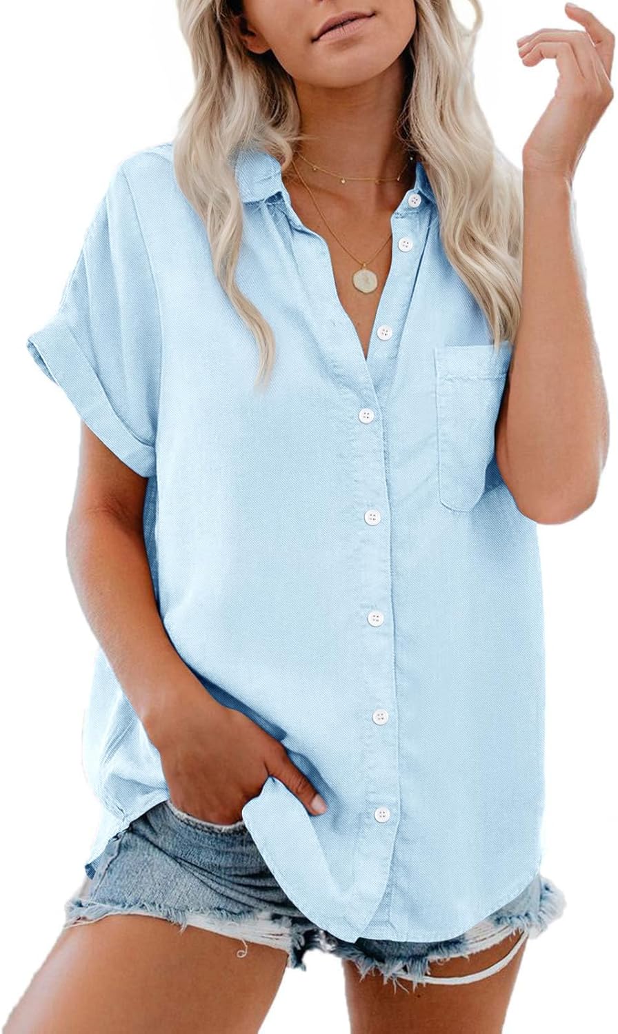Womens Button Down Shirts Short Sleeve Summer Oxford V Neck Collared Button Up Casual Blouses Tops with Pocket