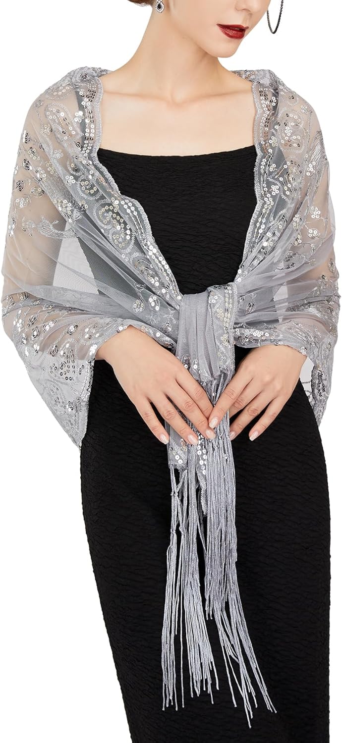 SWEETV Women's 1920s Long Shawl Wraps,Sequin Flapper Evening Shawls for women formal/Party/Wedding/Formal/Harlem night