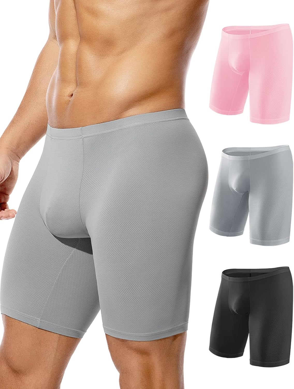 Casey Kevin Men's Long Leg Boxer Briefs Breathable Mesh Underwear Quick Dry Ice Silk Athletic Sports Underpants for Men Pack,Pink/Gray/Black,Medium