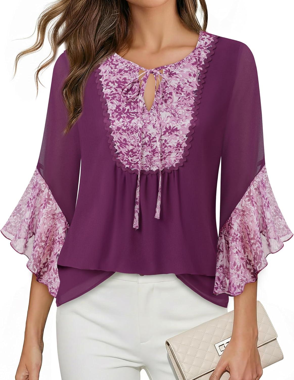 Lotusmile Womens Blouses Dressy Casual 3/4 Sleeve Tops Ruffle Floral V Neck Chiffon Trendy Work Shirts