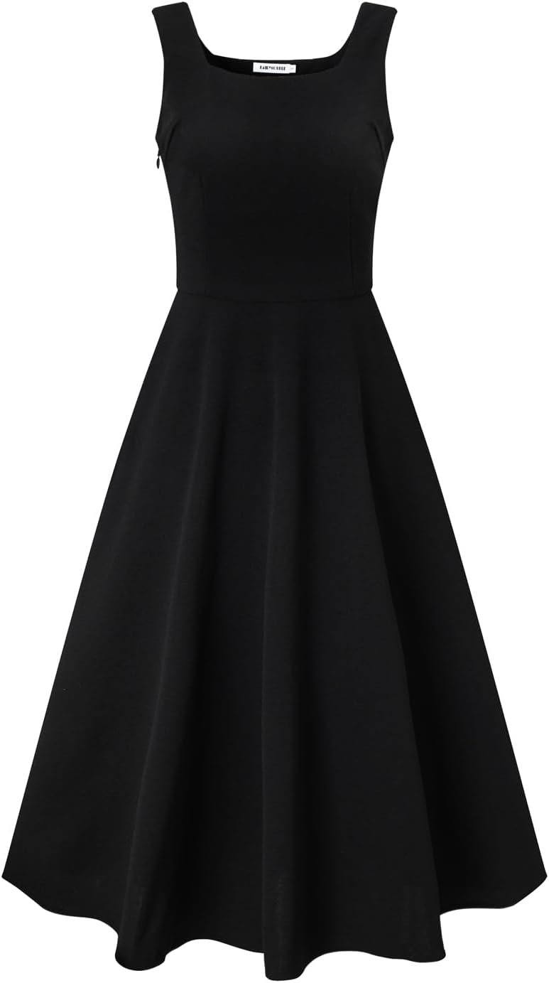 FAIRY COUPLE Black Square Neck Fit and Flare Midi Dress for Women Structured A-Line Cocktail Formal Wedding Guest