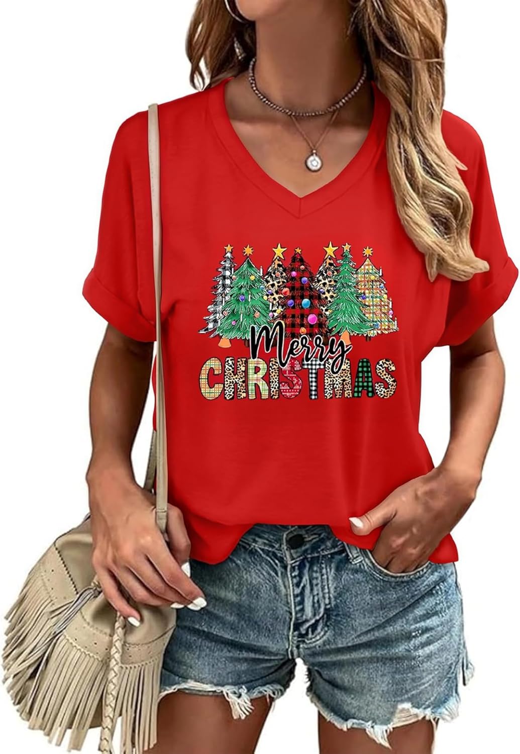 Merry Christmas T Shirts Women V Neck Graphic Holiday Tops Vacation Short Sleeve Xmas Buffalo Plaid Tree Tee