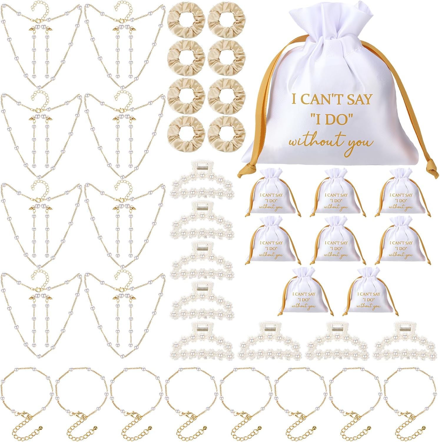 48 Pcs Bridesmaid Proposal Gift Jewelry Pouch Including Bridesmaid Bridal Scrunchies Pearl Hair Claw Clips Pearl Necklace Bracelet Earrings Suitable for Wedding