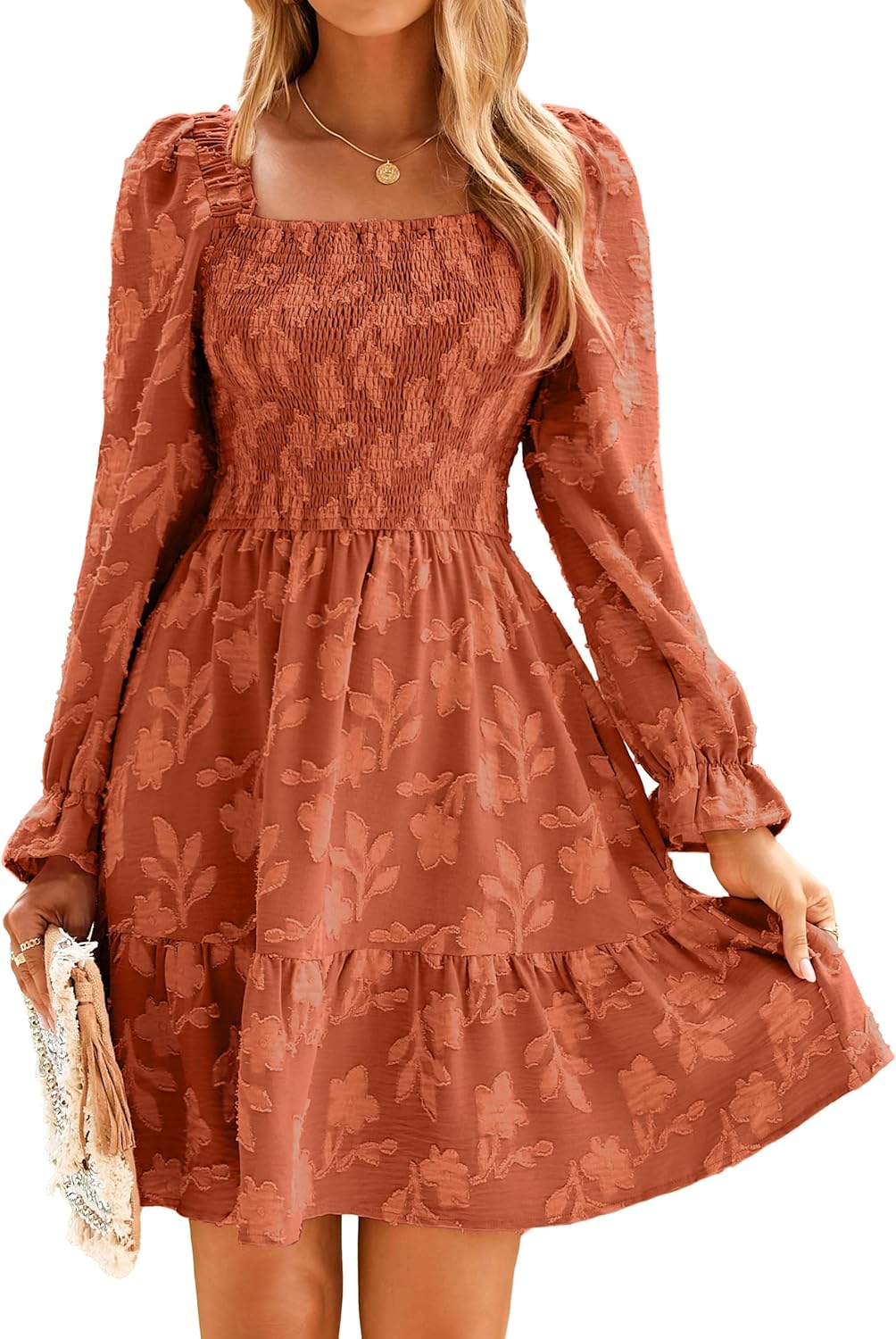 BerryGo Women's Square Neck Fall Long Sleeve Mini Dress Smocked Swing Ruffle Wedding Guest Dress