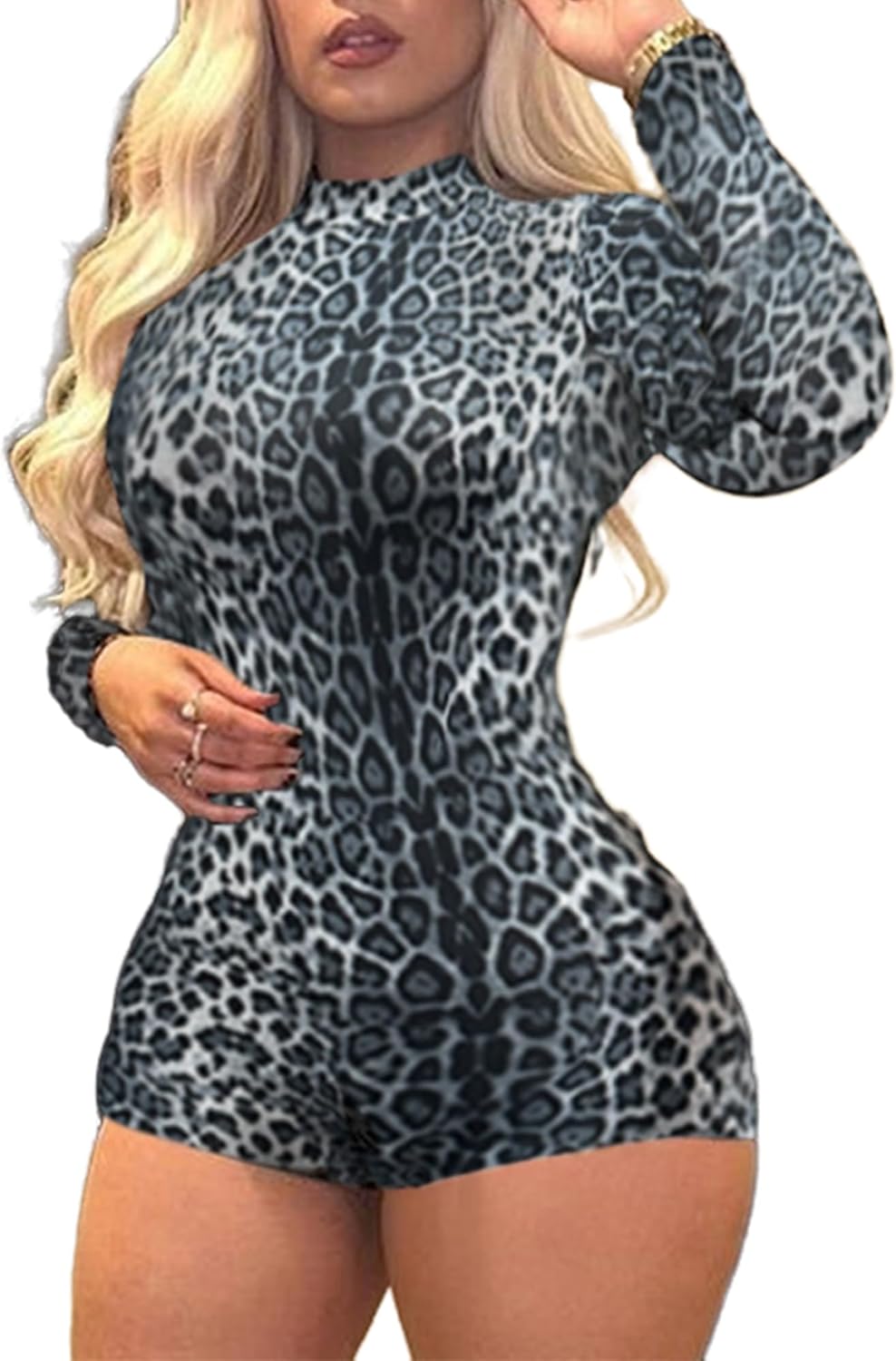 Molilove Womens Cheetah Print Romper Sexy Bodycon Shorts Jumpsuit Long Sleeve Crew Neck One Piece Outfits Y2K Trendy Clothes