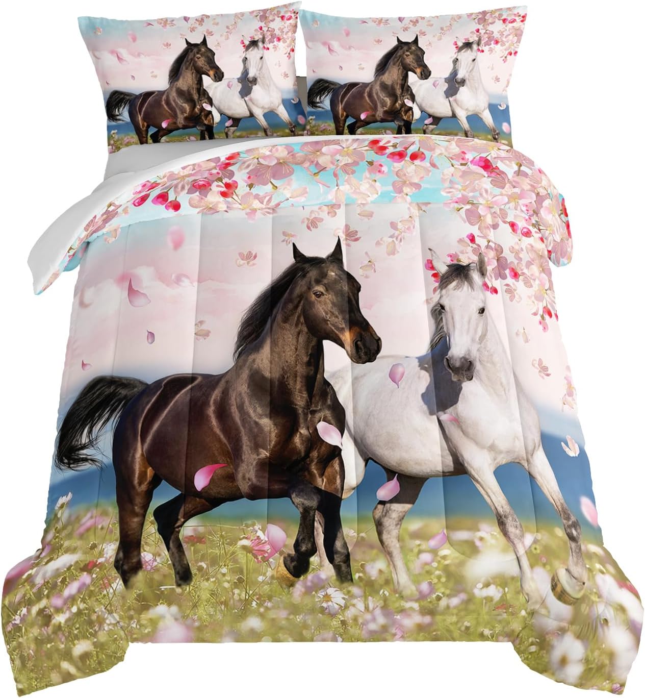 - 【Features】This comforter design central showcases several majestic horses galloping through a sea of delicate pink petals, with some petals scattered behind them.The White background and pink flower petals lend a soft and feminine touch to the design, making it an ideal gift for someone special in your life.