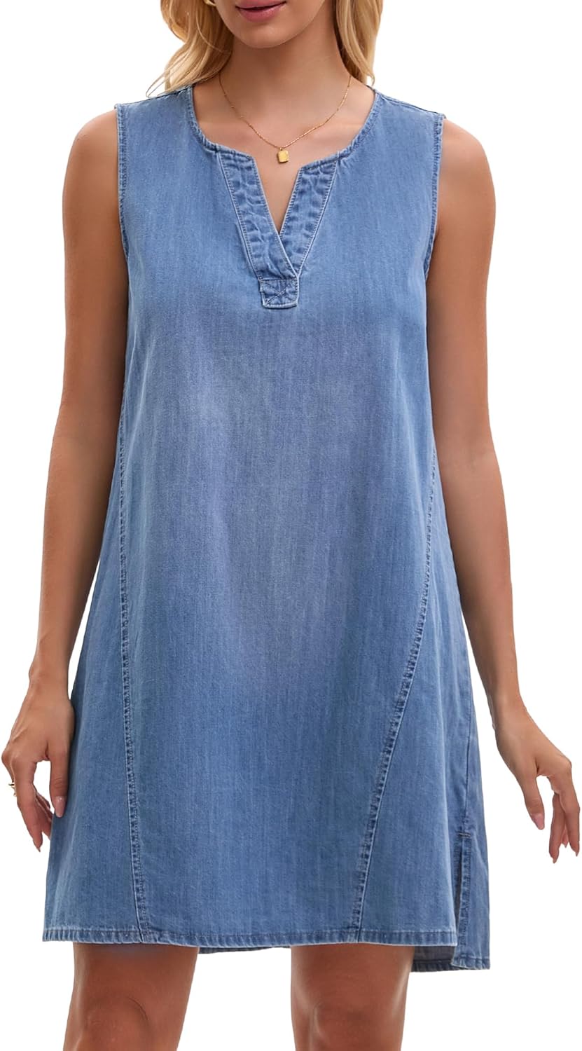 Women's Sleeveless Denim Dress Knee Length Casual Loose Tunic Jean Dress