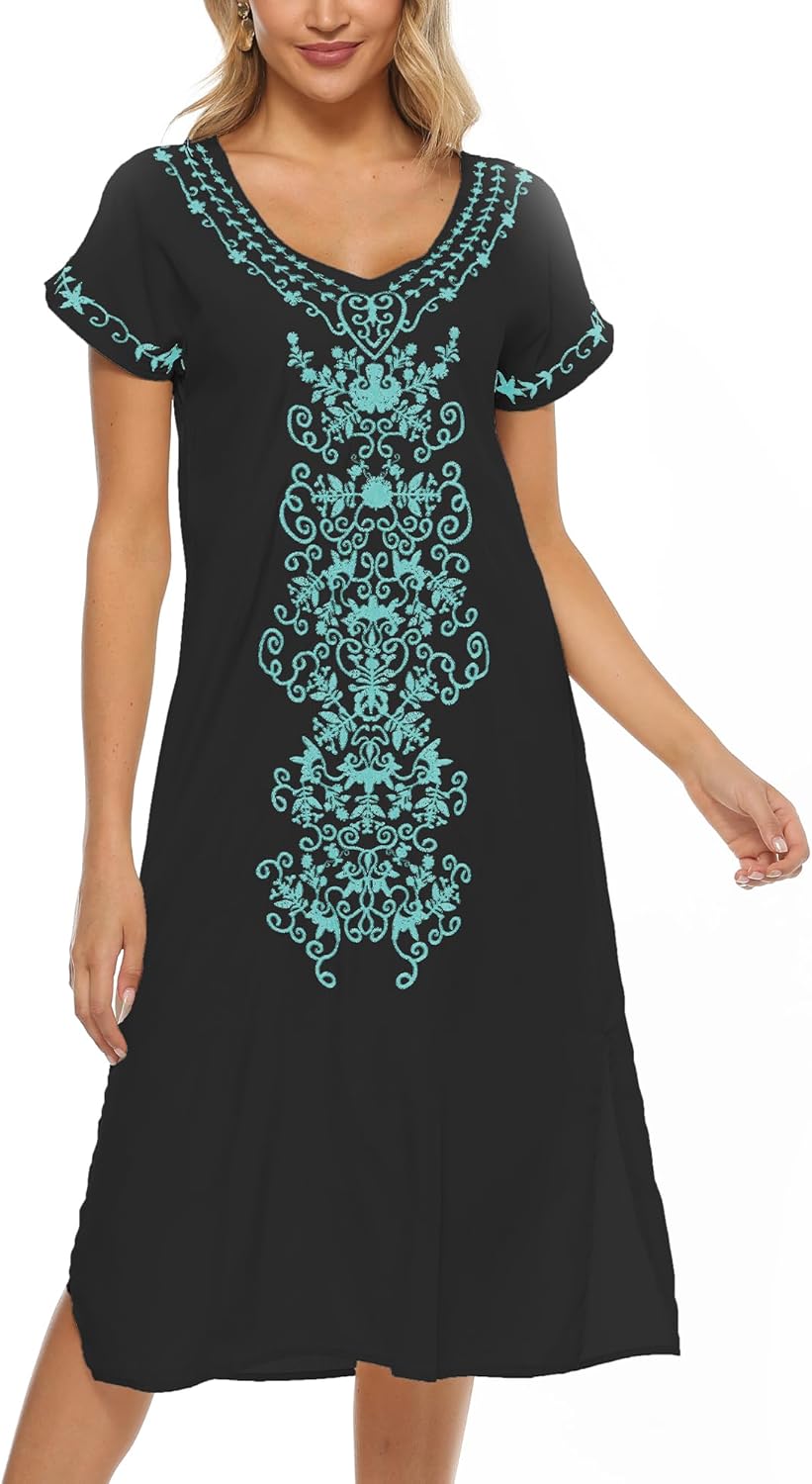 AK Caftan Boho Embroidered Dress for Women V-Neck Short Sleeve Mexican Floral Beach Cover Ups Midi Dress