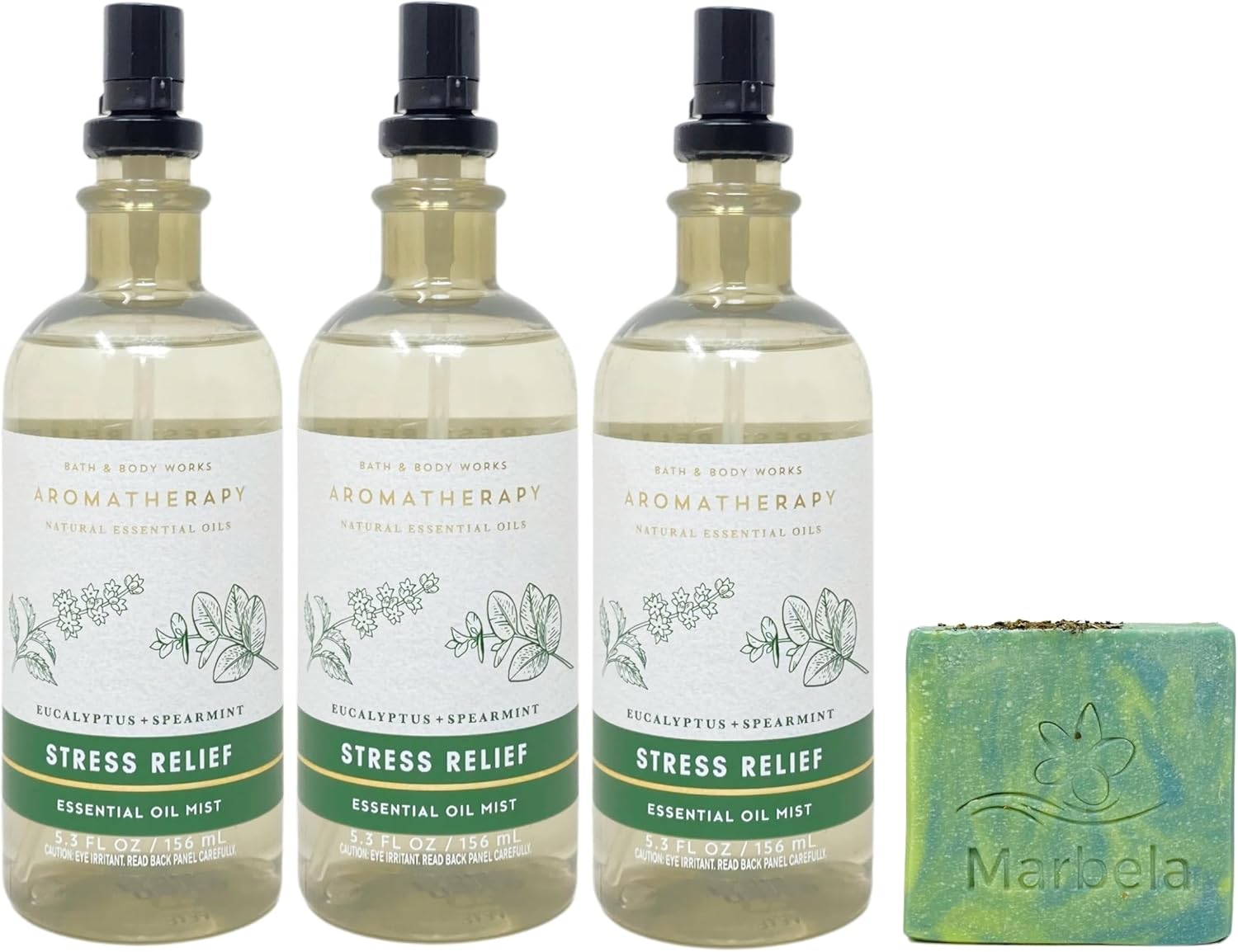 - Bath & Body Works Eucalyptus + Spearmint Stress Relief Essential Oil Mist Set with a Marbela Fresh Forest Bar Soap (Soap May Vary).