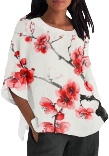 Womens Tops 3/4 Sleeve Japanese Art Print Cotton Linen Crewneck Summer Lounge Loose Fit Casual Shirts