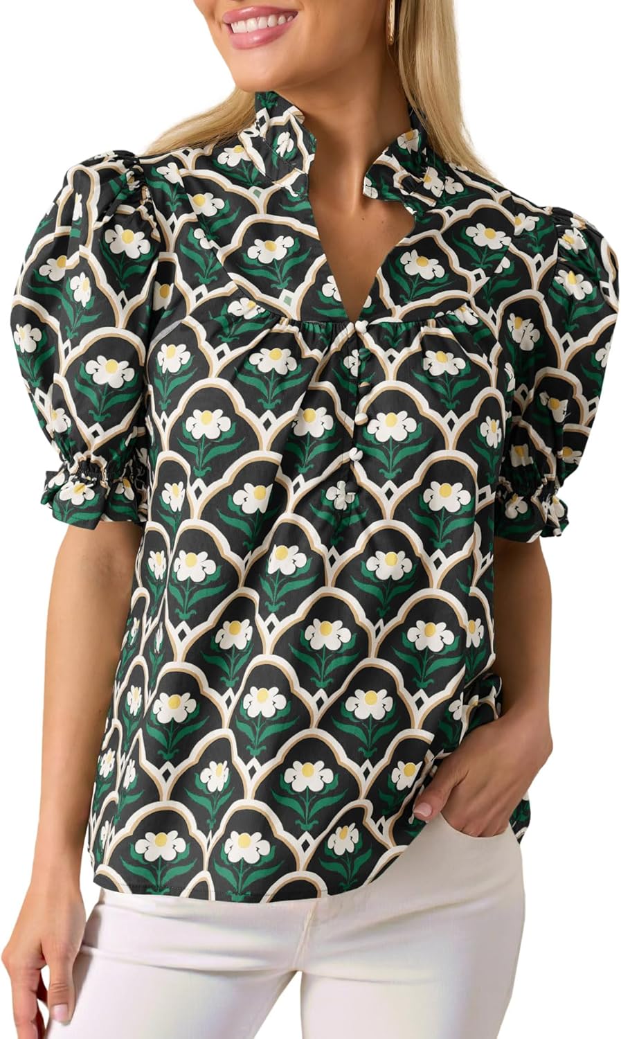 Womens Puff Short Sleeve Floral Shirt Ruffle V Neck Button Front Blouse Pleated Top