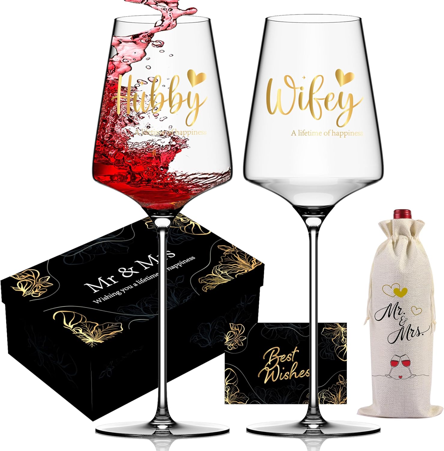 - Elegant wine glass gift set of 2, each glass is beautifully adorned with a delicate, shimmering gold foil print. One glass features the charming script. 'Hubby' and the other 'Wifey,' creating a sweet and personalized tribute to the engaged couple.