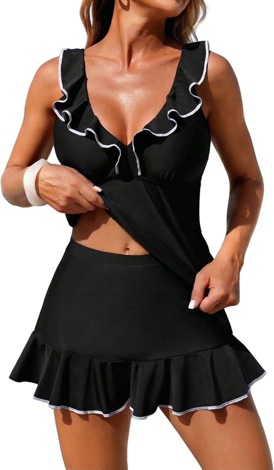 ZAFUL Women's Tankini Swimsuits V-Neck Ruffles Full Coverage Bathing Suit Swim Tank Top with Skirt