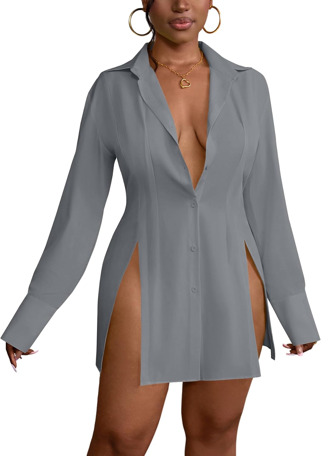 LYANER Women's Button Down Shirt Dress Collar V Neck Long Sleeve Slit Sexy Shirt Dresses