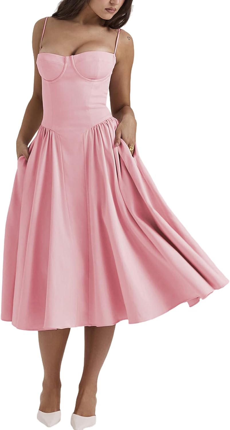 Women's Corset Dress Vintage Spaghetti Strap A-Line Midi Elegant Bustier Cocktail Party Evening Tea Dresses Pocket