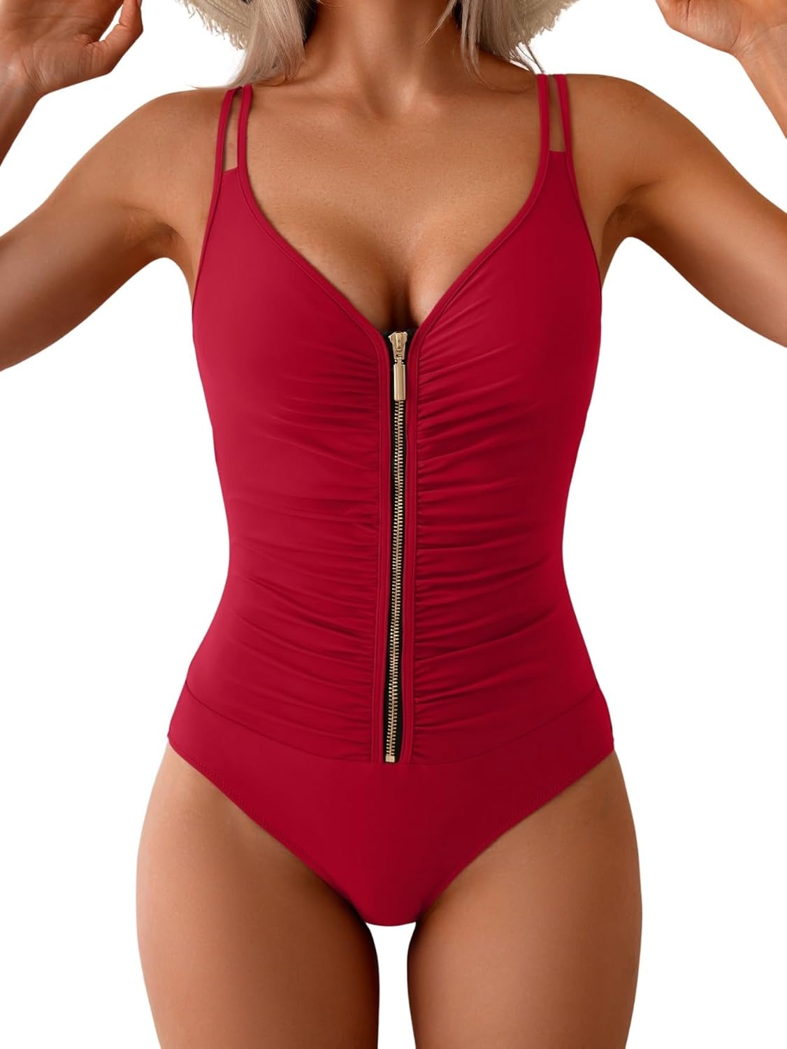 Eomenie One Piece Swimsuit for Women Zip Front Tummy Control Bathing Suit Ruched Slimming Swimwear Double Straps Swim Suit