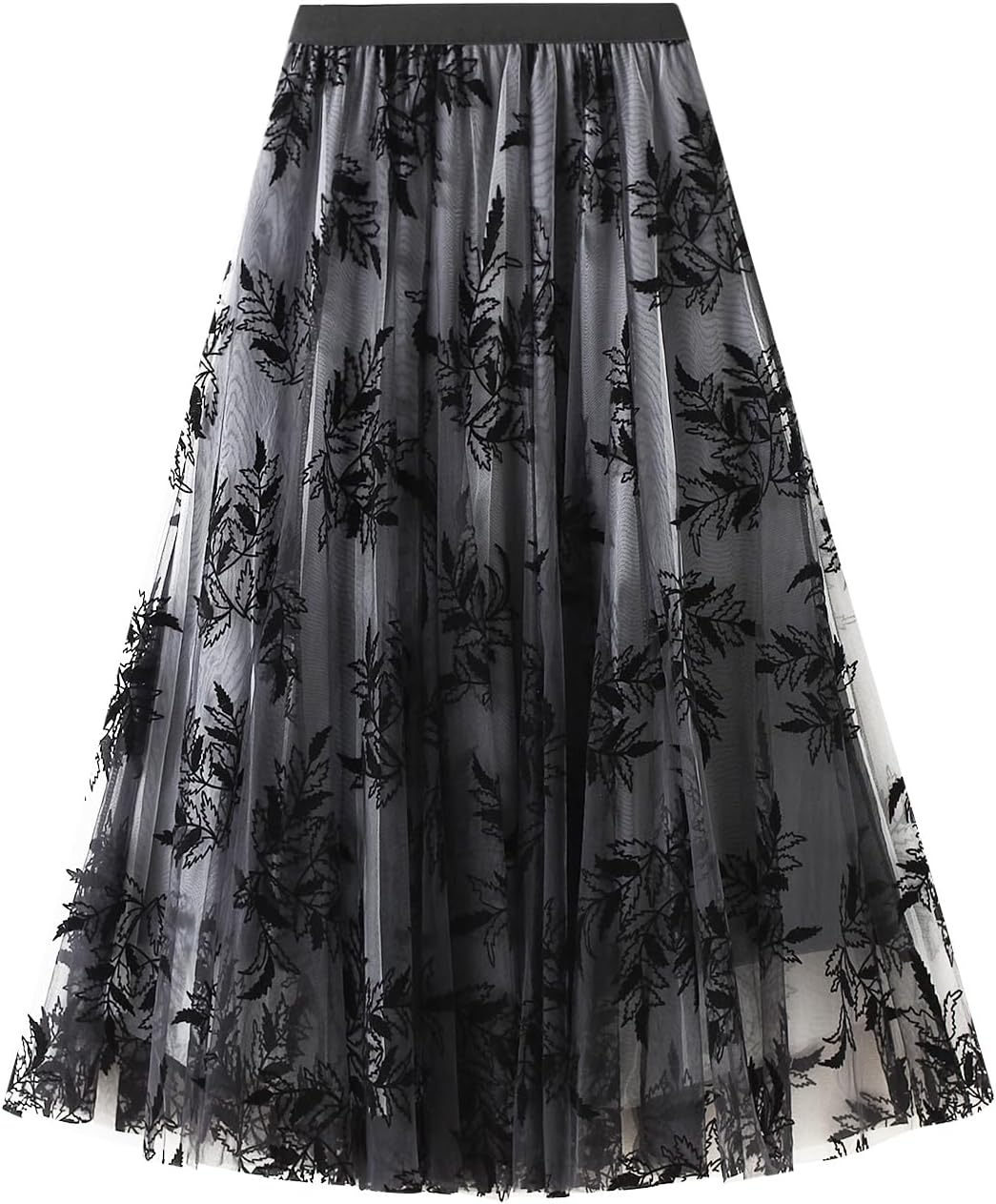 Women's Midi Length Skirt Layered Tulle A Line Skirts Embroidery/Floral Print Elastic Waist